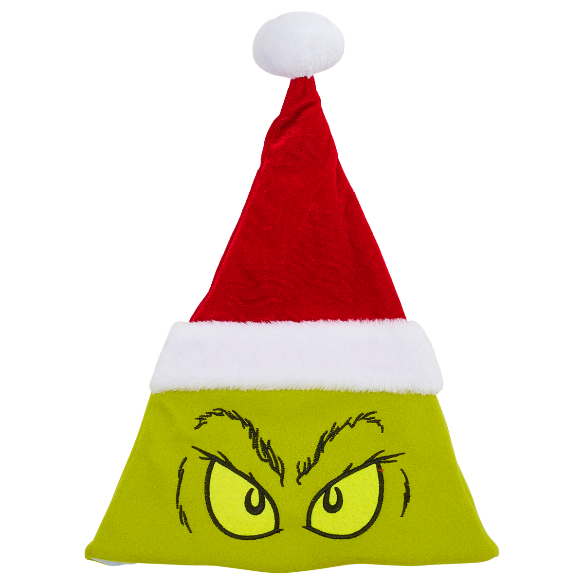 Celebrate the holidays in Dr. Seuss style wearing this novelty Santa hat! It features The Grinch's sneering eyes embroidered on the bottom as a classic red cap look shows on top with a white pom. …