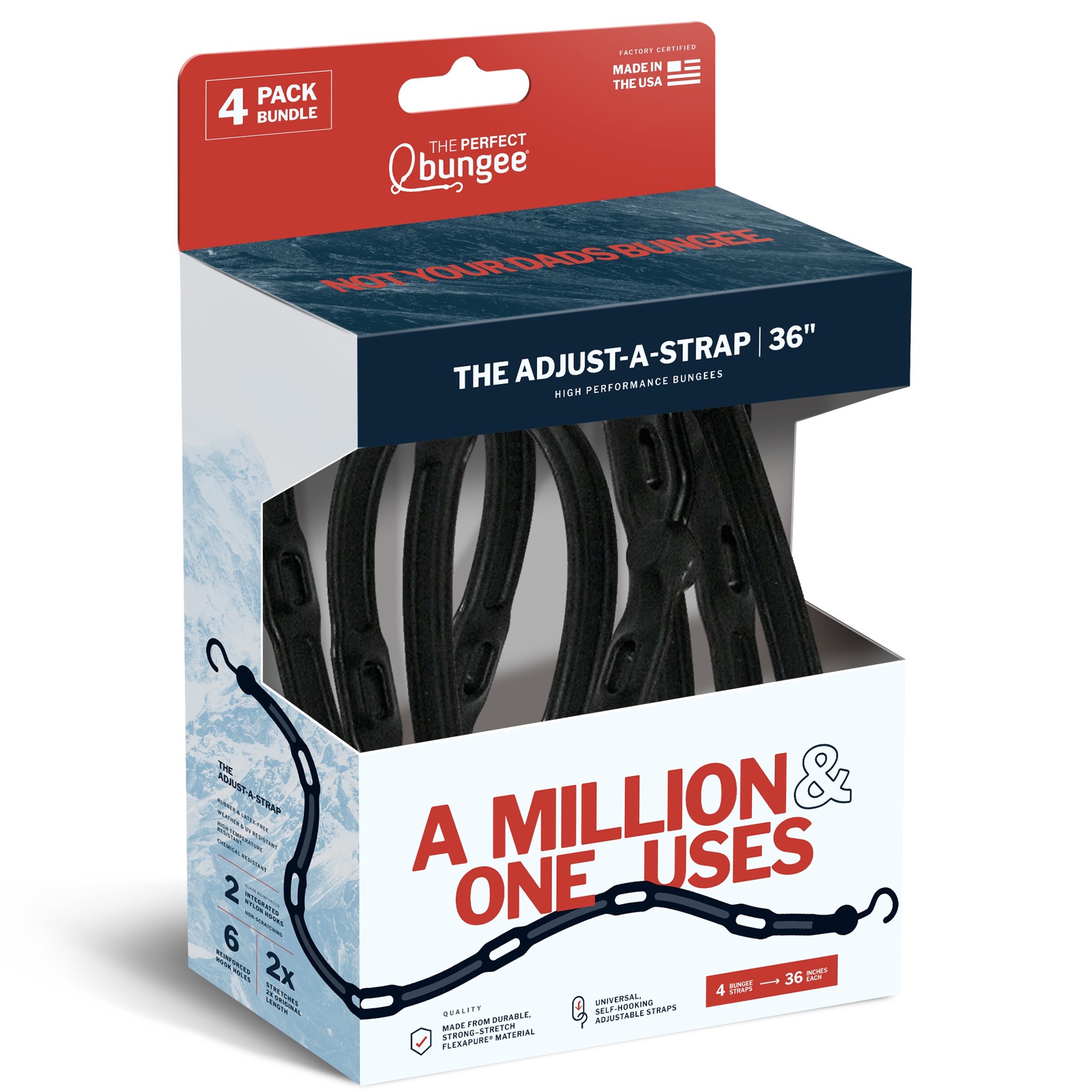 The Perfect Bungee 36" Adjust-A-Strap This premium adjustable length bungee cord features 6 reinforced holes to accommodate various load sizes and coverage, plus 2 integrated non-scratch nylon S-Hooks…