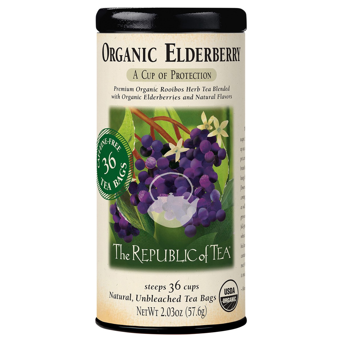Fine, organic rooibos herb tea blended with organic elderberries. USDA Organic. Certified Organic by Quality Assurance International. Caffeine free. Non GMO Project verified. nongmoproject.org. A cup …