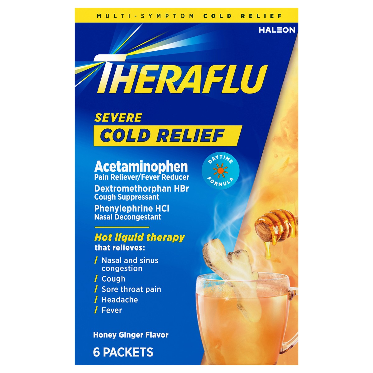 In Each Packet: Active Ingredients: Acetaminophen (650 mg)\, Pain Reliever/Fever Reducer; Dextromethorphan HBR (20 mg)\, Cough Suppressant; Phenylephrine HCl (10 mg)\, Nasal Decongestant. Inactive Ing…