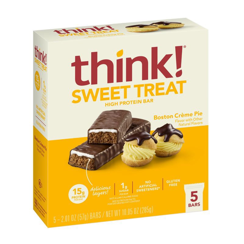 think!'s new Sweet Treat Boston Creme Pie High Protein bar combines luscious custard with a soft chocolate center for a smart, satisfying, craveable snack.• Contains: Sesame • Consistency: Creamy • Pr…