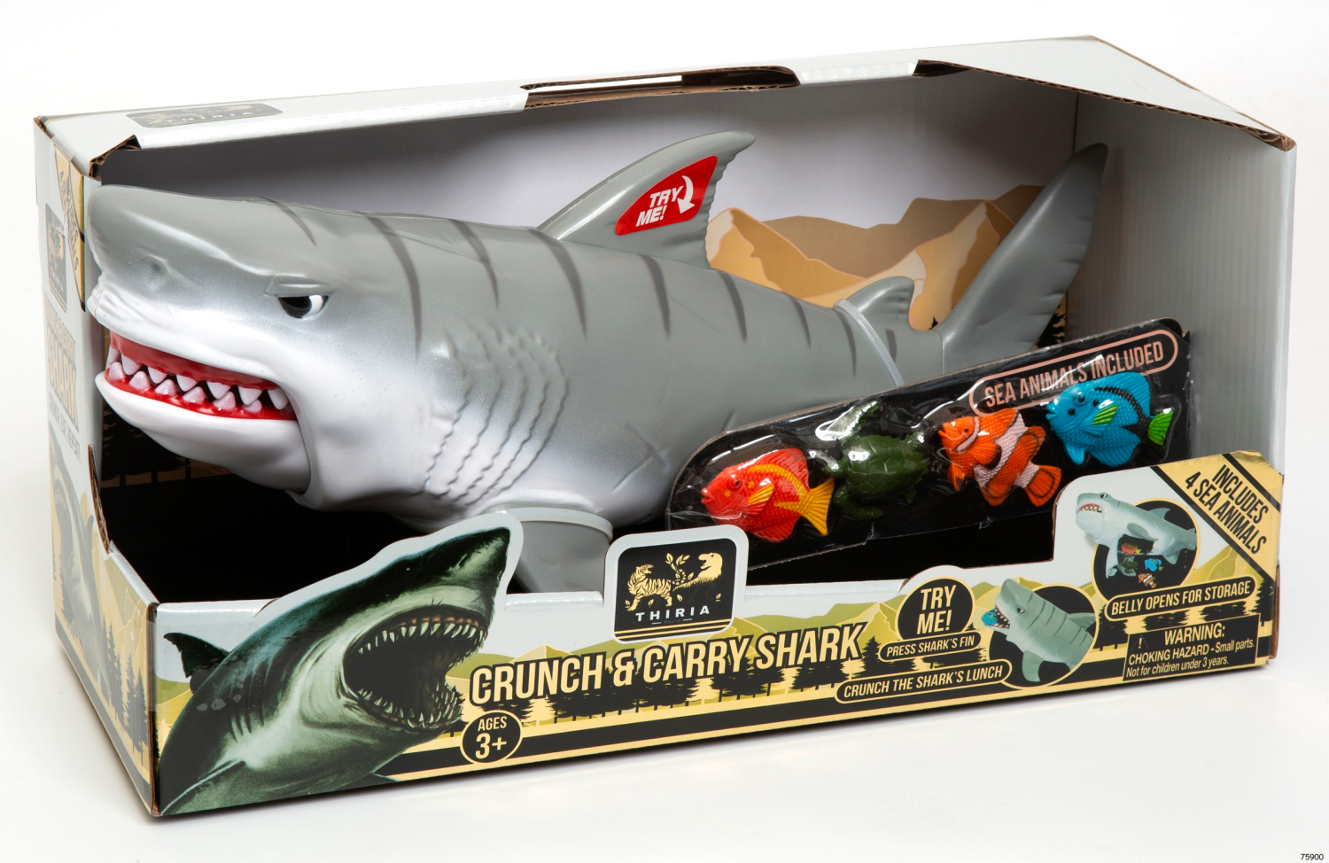 Satisfy the appetite of the mighty shark with an Thiria Crunch & Carry playset! This fearsome shark toy features a massive jaw that opens and closes with the push of a fin! Open up the shark's mouth, …