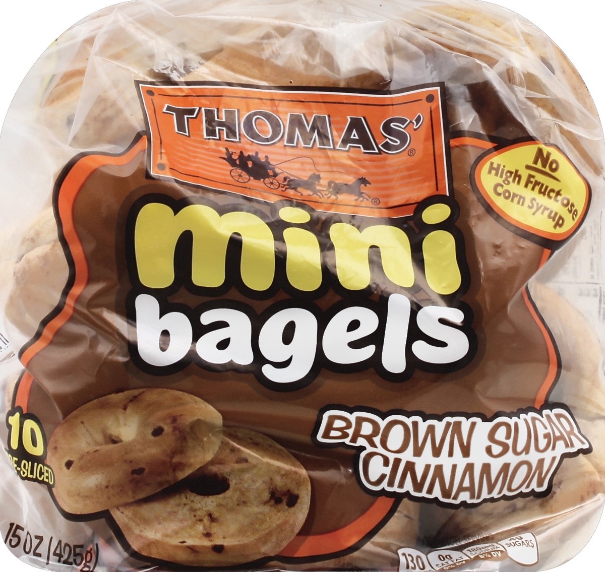 Pre-Sliced. No high fructose corn syrup. Per 1 Bagel Serving: 130 calories; 0 g sat fat (0% DV); 180 mg sodium (8% DV); 4 g sugars. Fuel up with your favorite variety of Thomas Mini Bagels - the perfe…