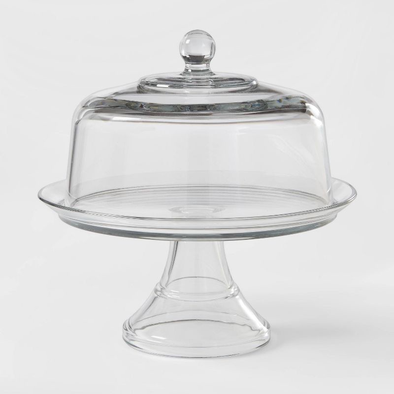 Give your party desserts a spectacular presentation with this Classic Glass Cake Stand with Dome from Threshold™. This lovely round cake stand made from clear glass is great for special occasions and …