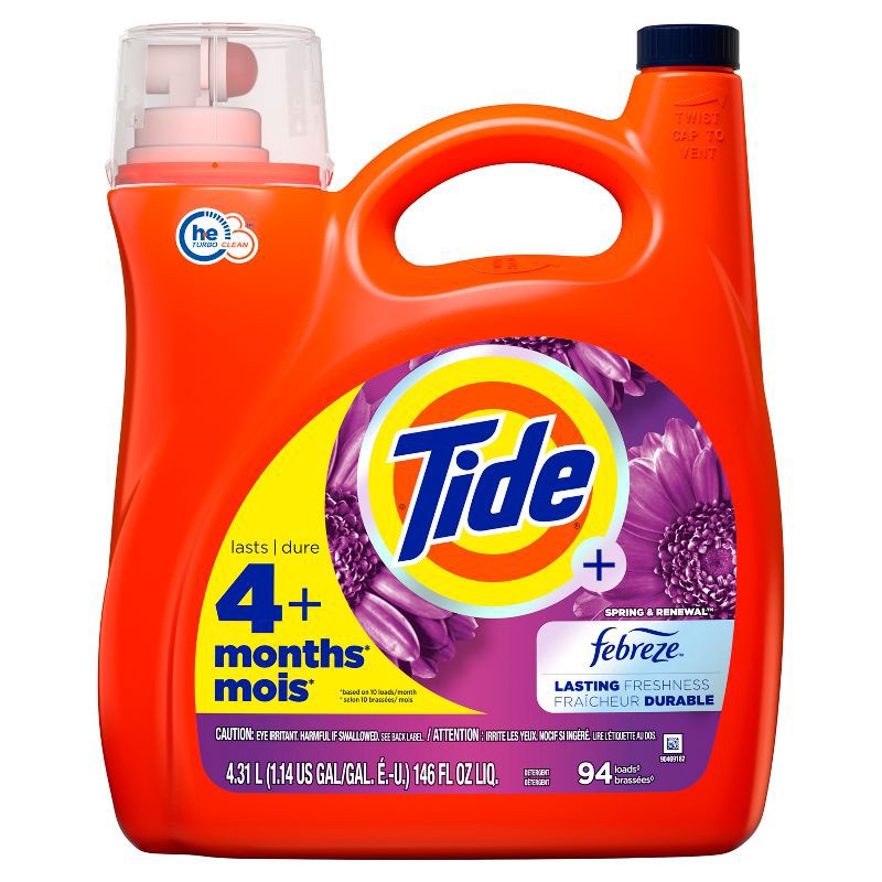 Tide Plus Febreze Freshness Spring & Renewal HE Turbo Clean liquid laundry detergent offers excellent clean and odor removal, plus the Febreze freshness that helps your fabrics stay fresh up to 3x lon…