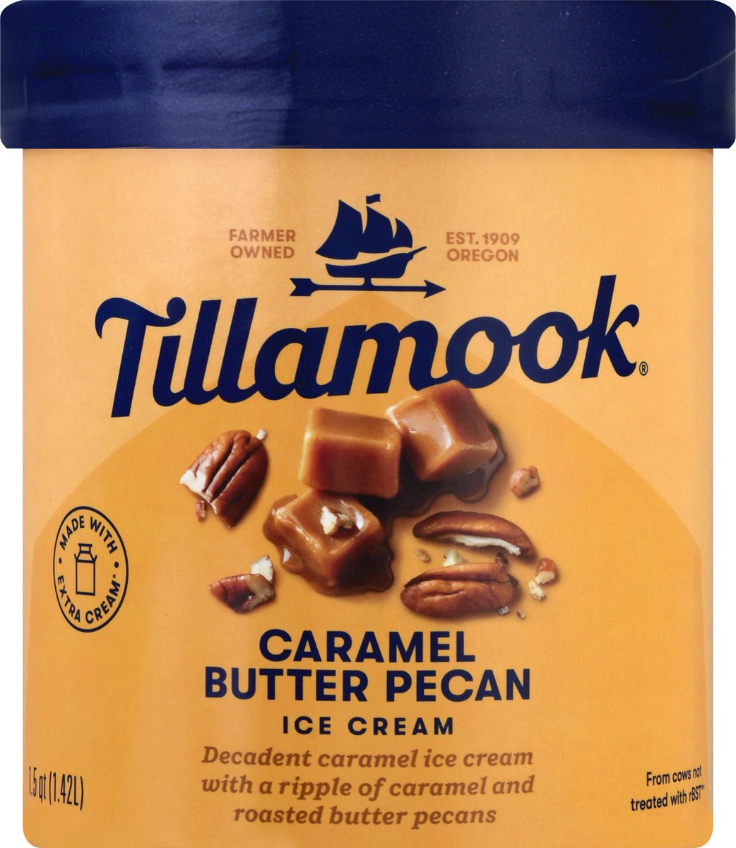 Decadent caramel ice cream with a ripple of caramel and roasted butter pecans. Farmer owned. Est. 1909 Oregon. Made with extra cream (Tillamook ice cream is made with more cream than is legally requir…