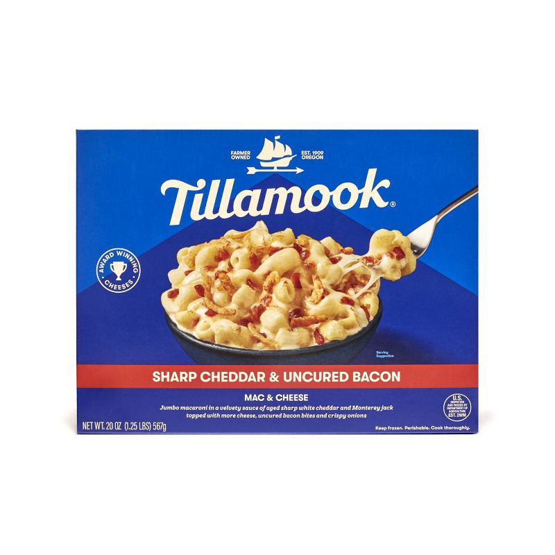 Tillamook Sharp Cheddar & Uncured Bacon Mac & Cheese - Jumbo macaroni in a velvety sauce of aged sharp white cheddar and Monterey Jack cheeses topped with more Farmstyle Shredded Cheese, uncured bacon…