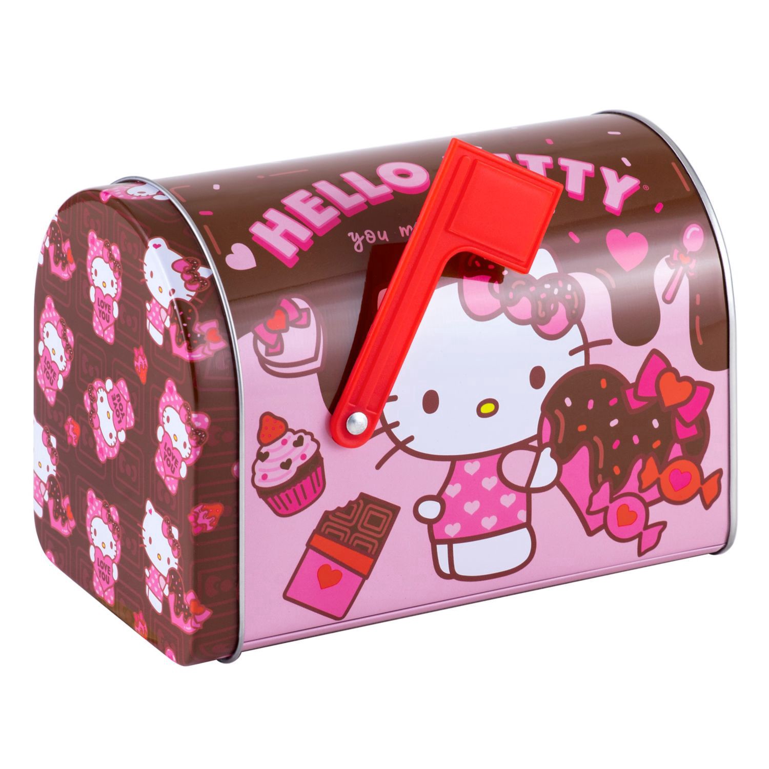 This beautiful tin mail box features licensed art from Hello Kitty. Great for storage for the Valentines Day season and for gift giving to the Hello Kitty Fan.