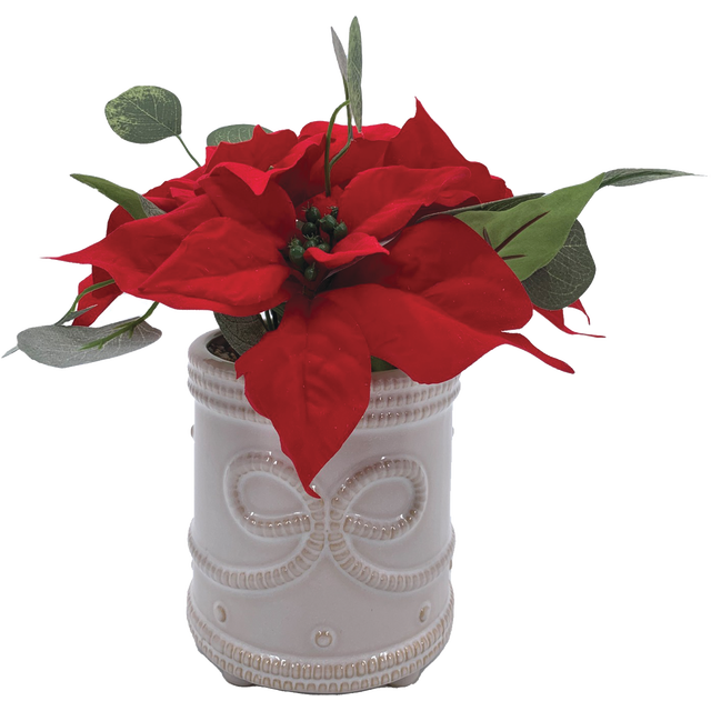 Bring timeless elegance to your holiday décor with our 9.5-Inch Tabletop Christmas Poinsettia Arrangement. Featuring vibrant artificial poinsettia blooms in a crisp white ceramic vase, this festive pi…