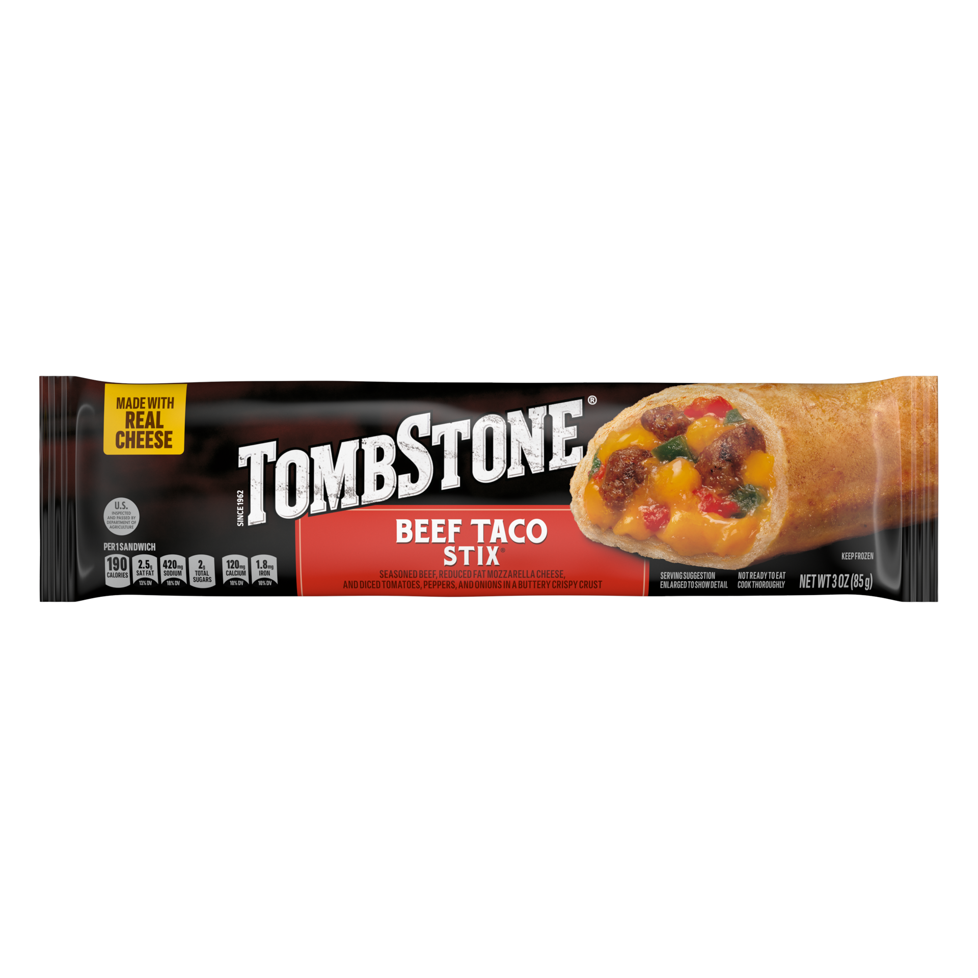Tombstone Beef Taco Stix Frozen Snacks are a delicious way to beat hunger. These beef tacos are made with seasoned beef, reduced fat mozzarella cheese, diced tomatoes, peppers, and onions. All of thes…