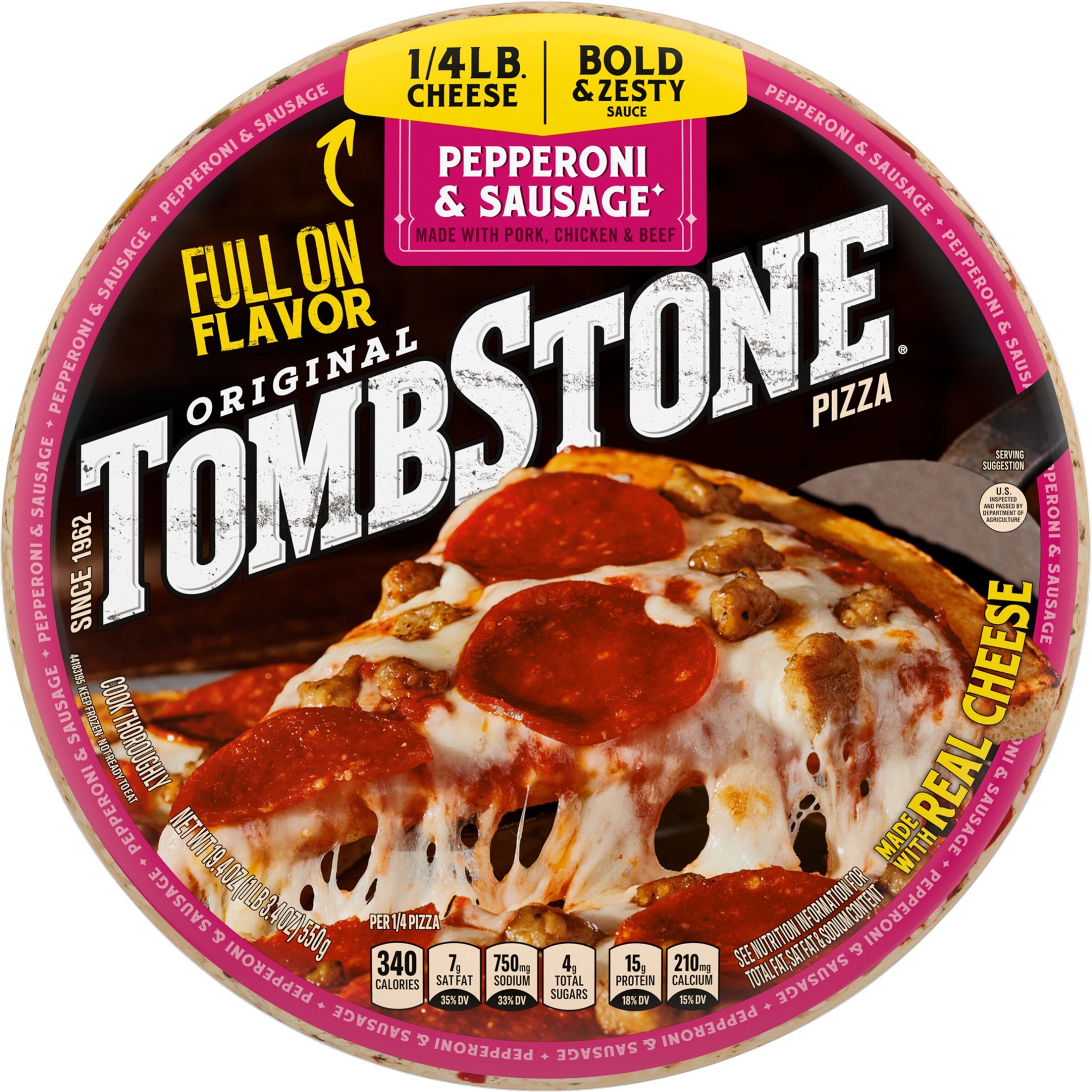 Tombstone Pepperoni and Sausage Frozen Pizza delivers full on flavor held up by a buttery and crispy crust. This Tombstone pizza comes topped with bold and zesty tomato pizza sauce and real cheese, al…