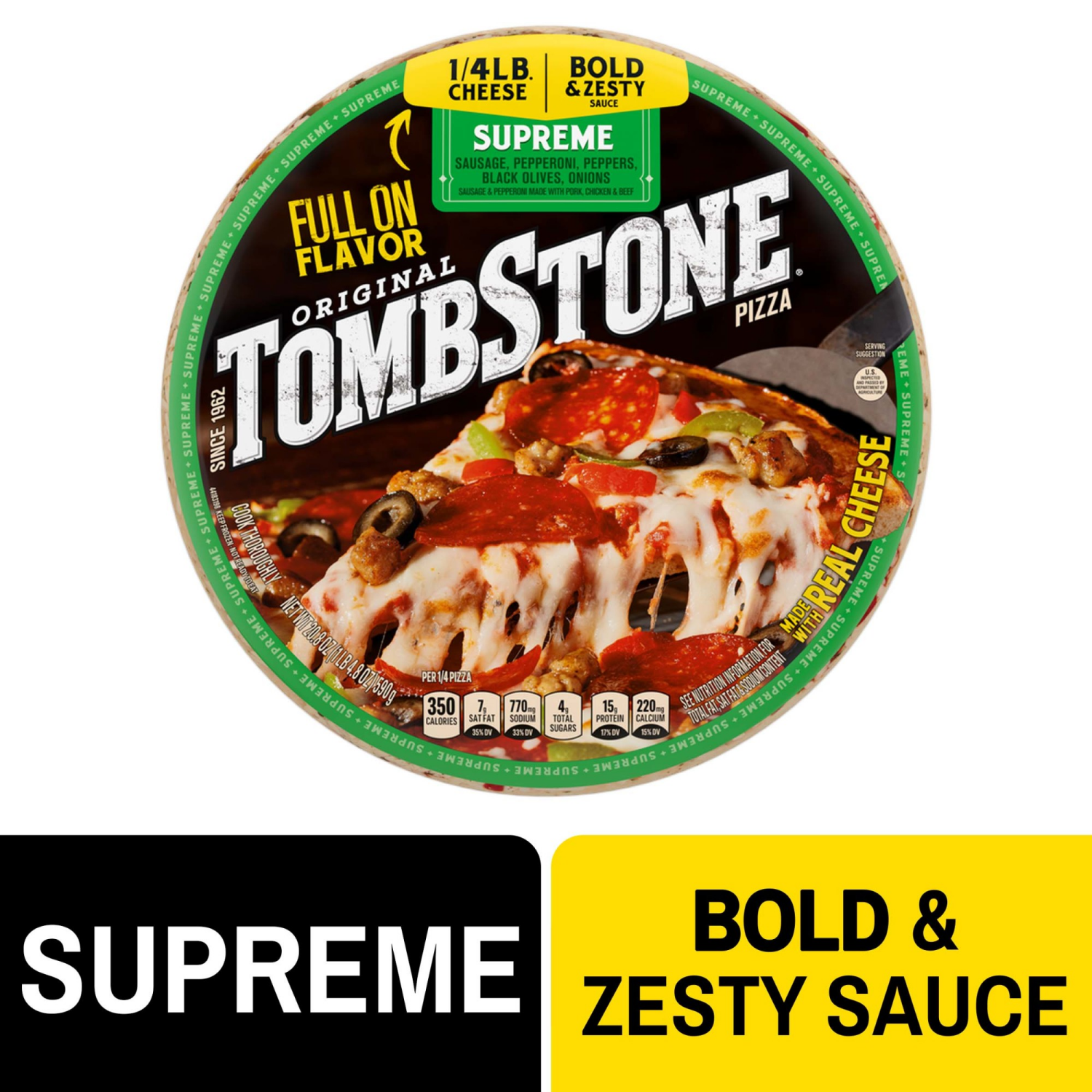 Tombstone Classic Supreme Frozen Pizza delivers full on flavor held up by a buttery and crispy crust. This Tombstone pizza comes topped with zesty sauce, real cheese along with sausage, pepperoni, pep…