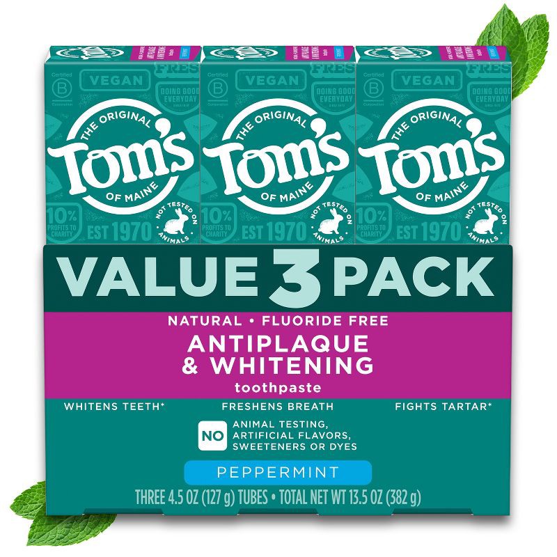 - Includes three (3) 4.5 oz Tom's of Maine Antiplaque and Whitening Fluoride Free Toothpaste tubes