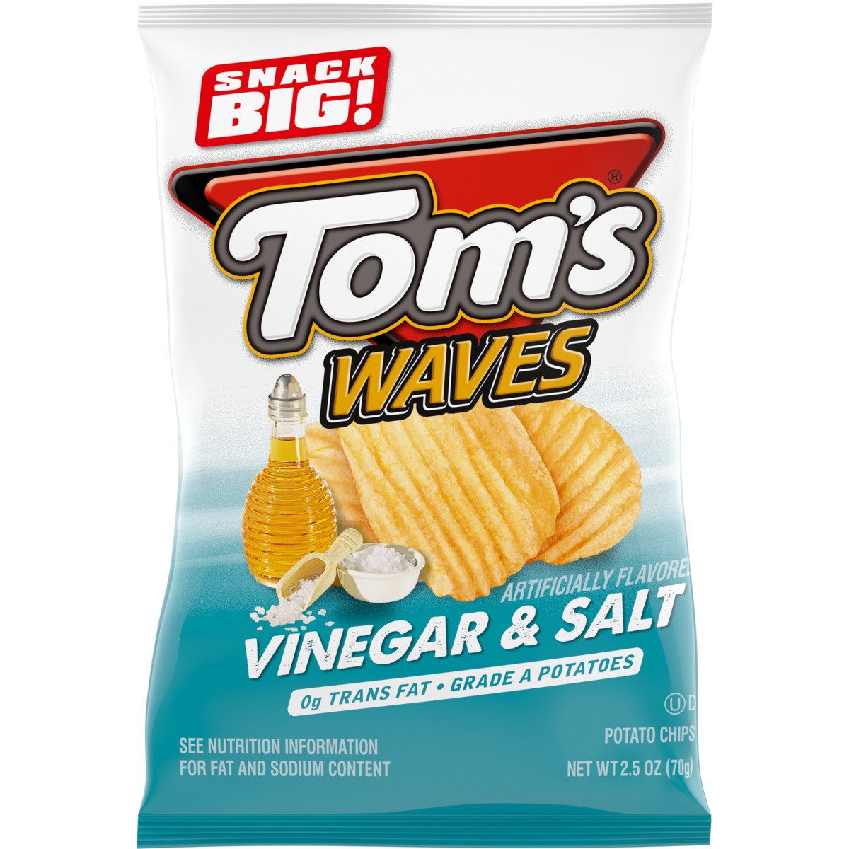 Get ready for a big blast of flavor! Behind the light crunch of Tom's potato chips is a hearty punch of vinegar and salt bang! Anytime is Tom's time.