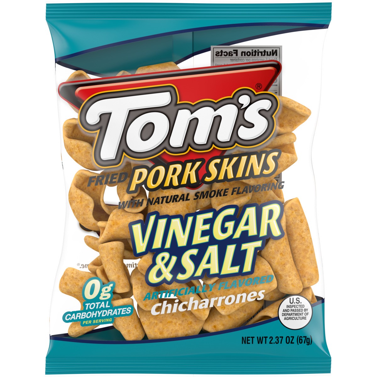 One tasty and intense snack experience. The combination of vinegar flavor and salt pairs well with the crunch of the classic Tom's Pork Skins. Anytime is Tom's time.