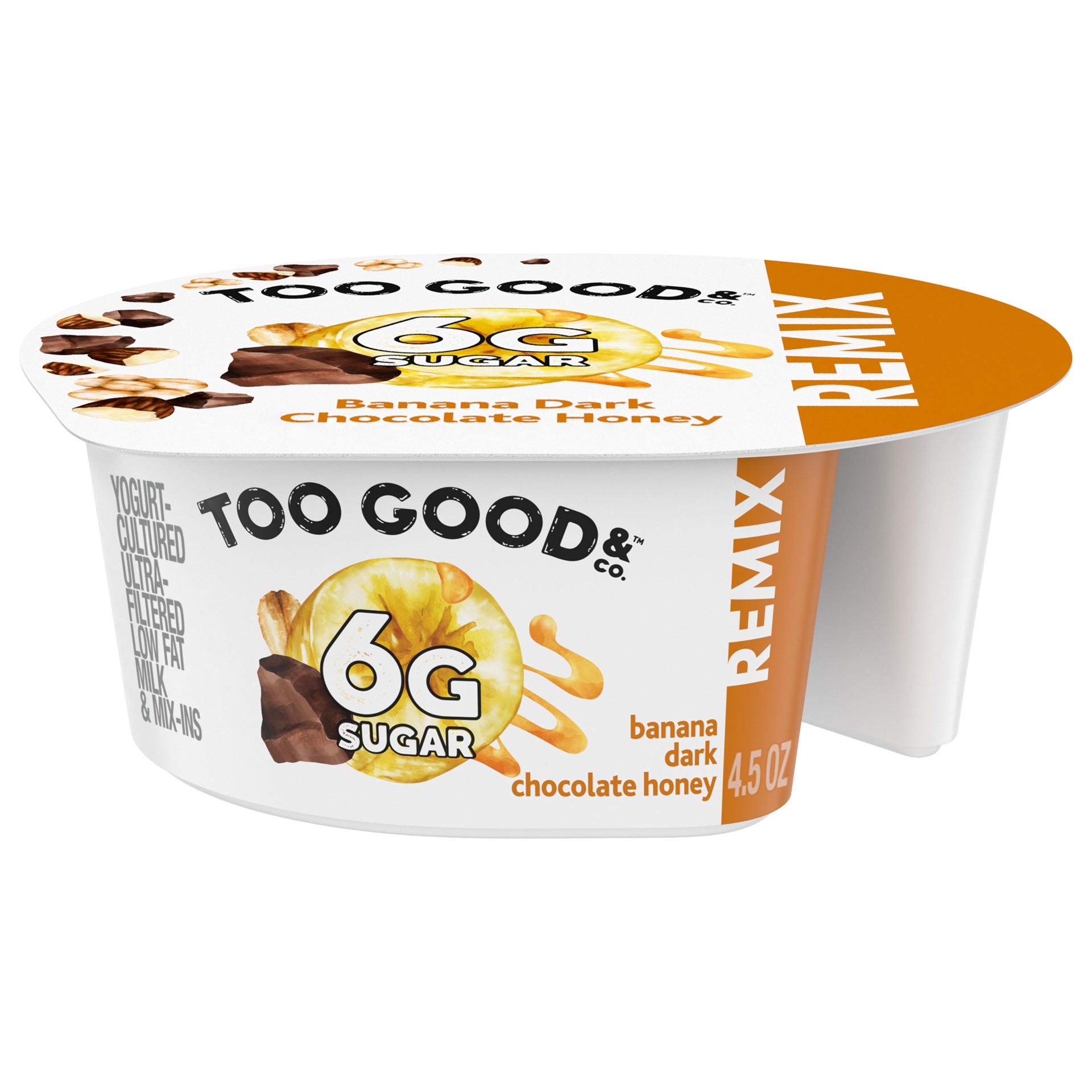 Too Good & Co. REMIX Banana Flavored Low Fat Yogurt-Cultured Ultra-Filtered Low Fat Milk with Roasted Almond, Dark Chocolate and Honey Flavored Crisp Mix Ins is the snack that brings a smile with ever…