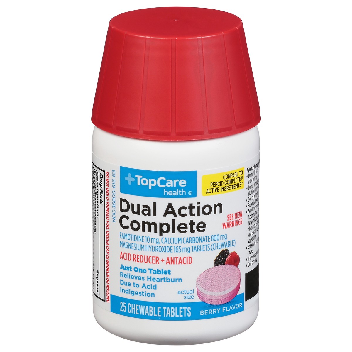 Active Ingredients: Famotidine (10 mg), Acid reducer; Calcium Carbonate (800 mg), Antacid; Magnesium Hydroxide (165 mg), Antacid. Inactive Ingredients: Anhydrous Lactose, Artificial Berry Flavor, Aspa…