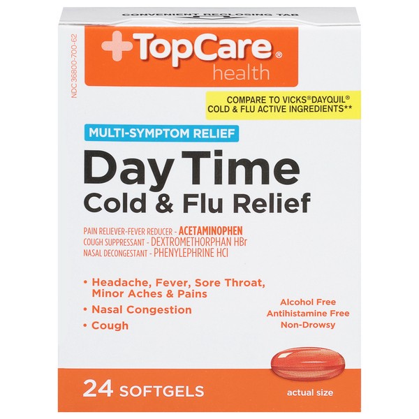 In Each Softgel: Active Ingredients: Acetaminophen (325 mg), Pain Reliever/Fever Reducer; Dextromethorphan HBr (10 mg), Cough Suppressant; Phenylephrine HCl (5 mg), Nasal Decongestant. Inactive Ingred…