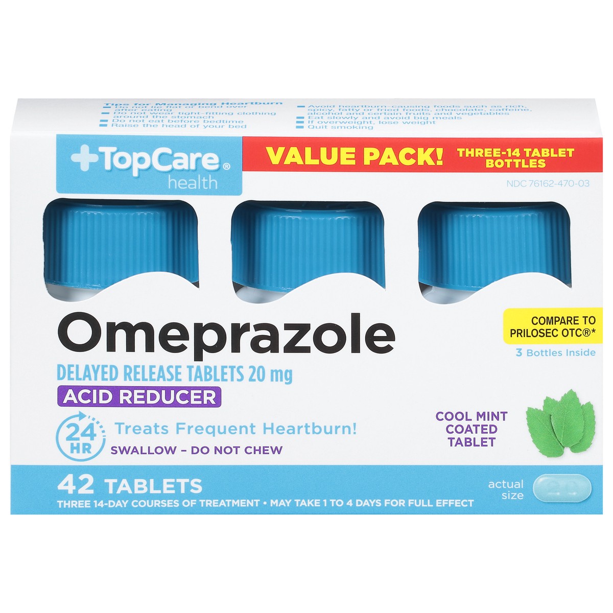 In Each Tablet: Active Ingredients: Omeprazole (20 mg), Acid Reducer. Inactive Ingredients: Carnauba Wax, FD&C Blue 1/Brilliant Blue FCF Aluminum Lake, Hypromellose, Hypromellose Acetate Succinate, La…