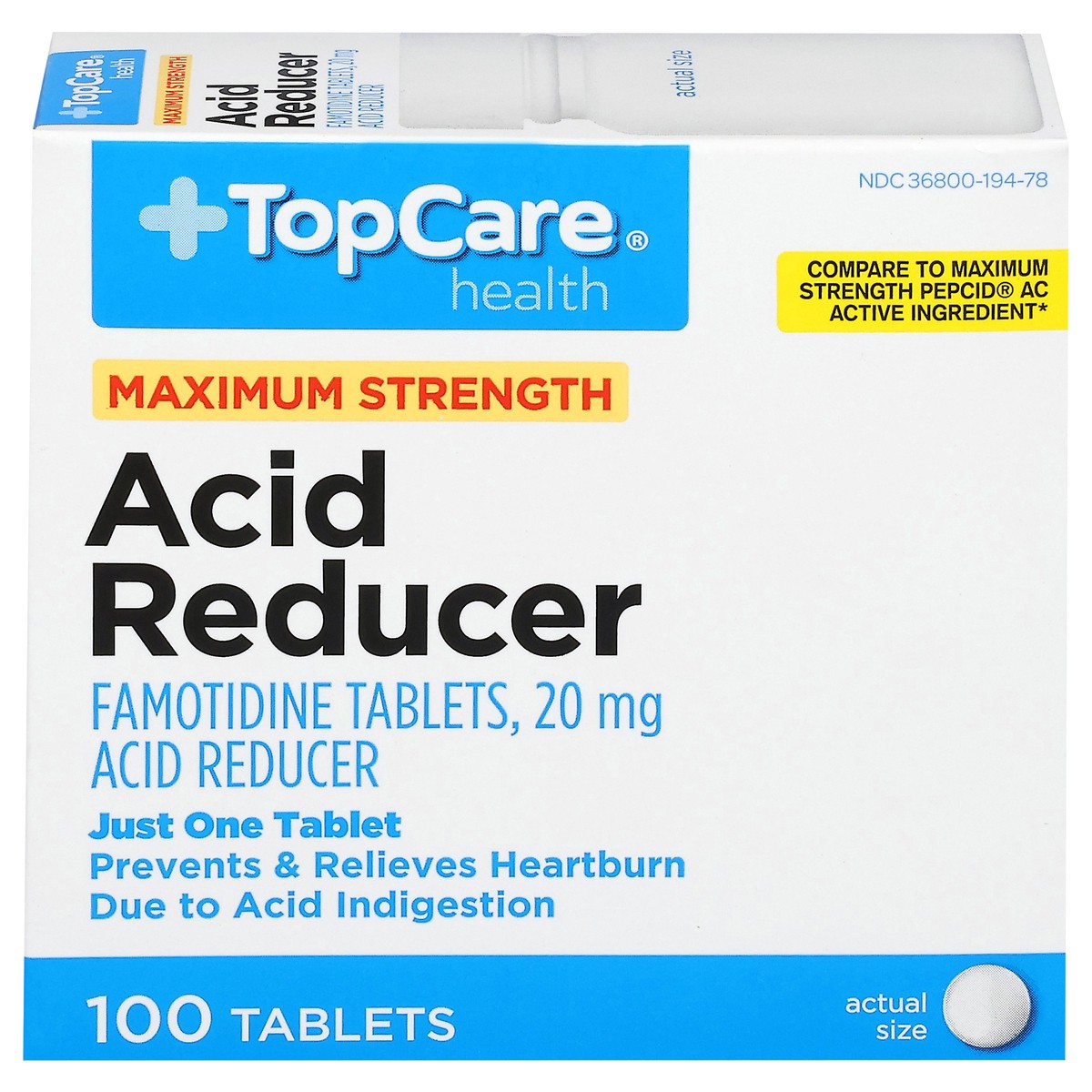 In Each Tablet: Active Ingredients: Famotidine (20 mg), Acid Reducer. Inactive Ingredients: Carnauba Wax, Colloidal Silicone Dioxide, Croscarmellose Sodium, Lactose Monohydrate, Magnesium Stearate, Mi…