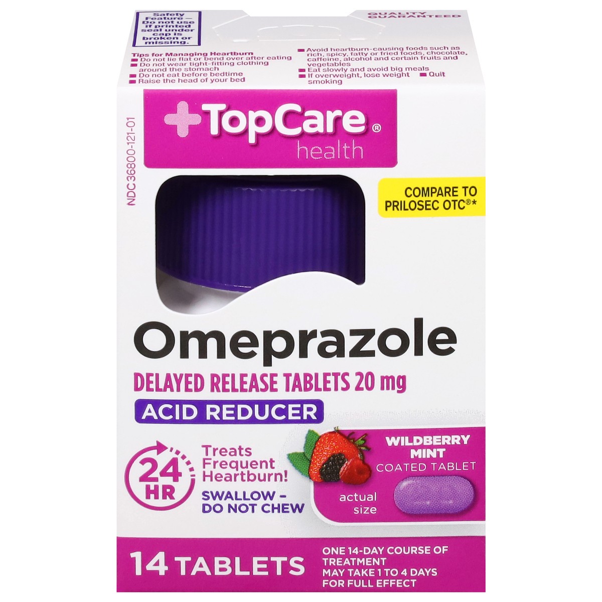 In Each Tablet: Active Ingredients: Omeprazole (20 mg), Acid Reducer. Inactive Ingredients: Benzyl Alcohol, Carmine, Carnauba Wax, FD&C Blue 2/Indigo Carmine Aluminum Lake, Flavor, Hypromellose, Hypro…
