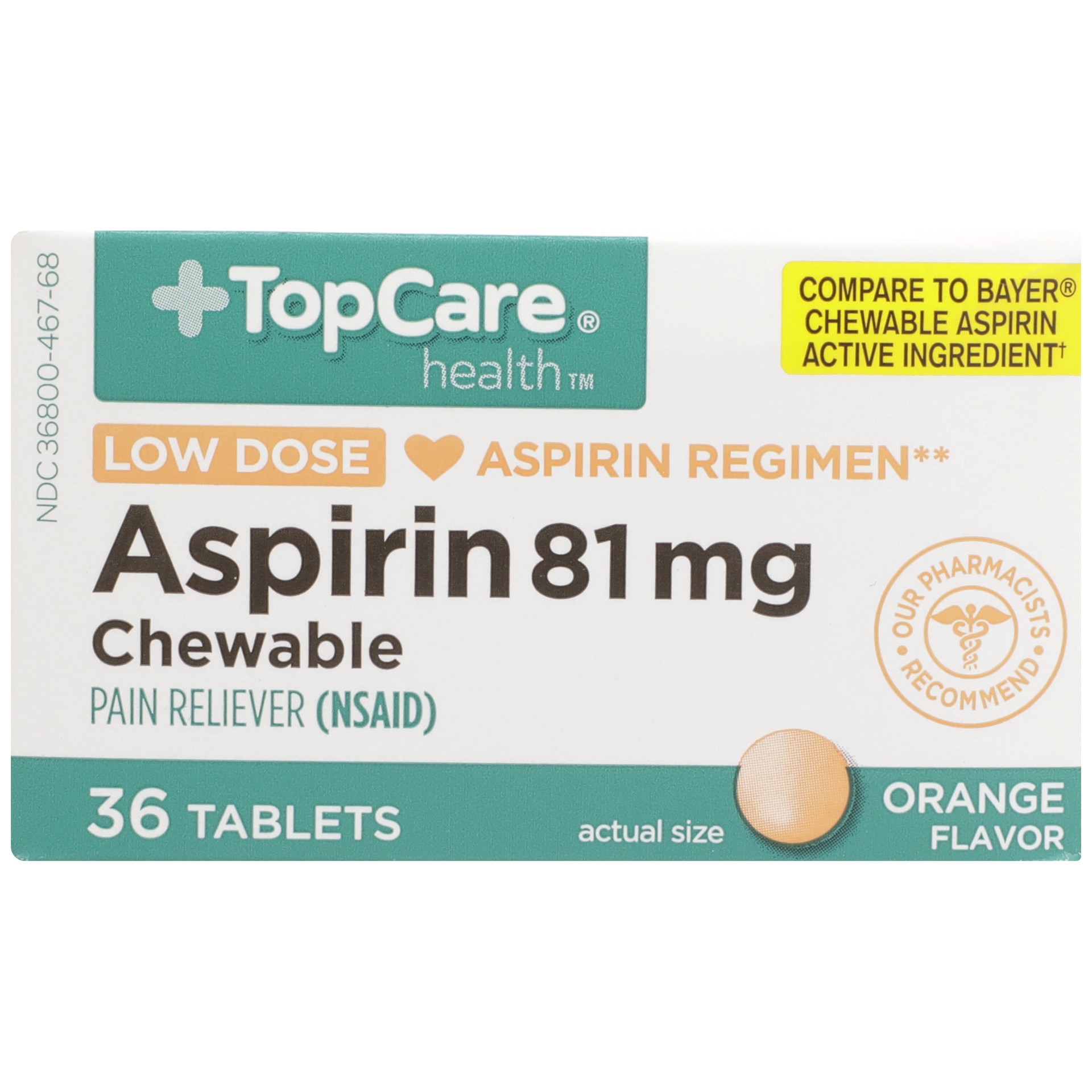 In Each Chewable Tablet: Active Ingredients: *Aspirin (NSAID) (81 mg), Pain Reliever. Inactive Ingredients: Corn Starch, Dextrose Excipient, FD&C Yellow 6 Aluminum Lake, Flavors, Saccharin Sodium. *No…