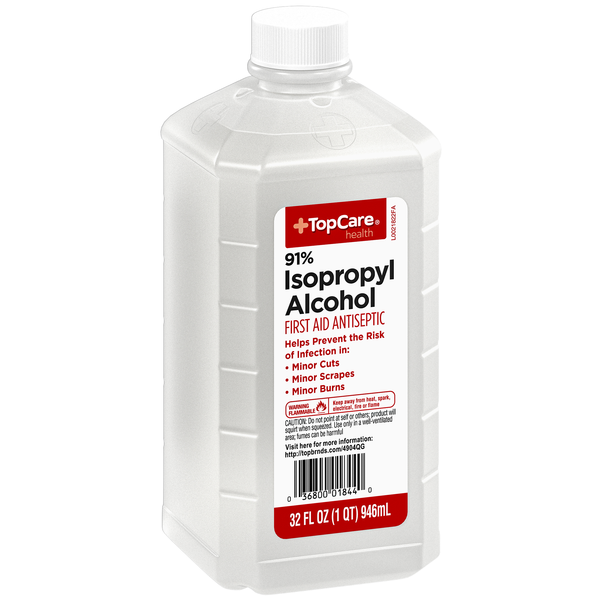 TopCare Health 91% Isopropyl Alcohol – First aid antiseptic used to help prevent infection in minor cuts, scrapes, and burns. Contains 32 FL OZ (946 mL). Includes safety warnings and usage cautions. V…