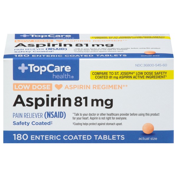 In Each Tablet: Active Ingredients: *Aspirin (NSAID) (81 mg), Pain Reliever. Inactive Ingredients: Colloidal Anhydrous Silica, Corn Starch, FD&C Red 40, FD&C Yellow 6, Hypromellose, Methacrylic Acid, …