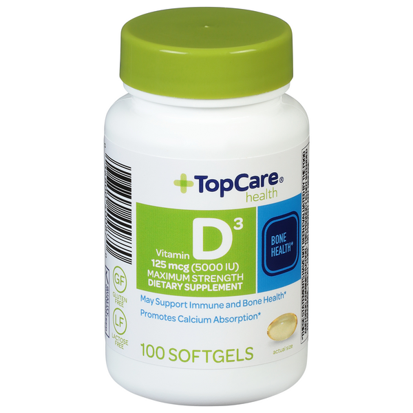 slide 1 of 1, TopCare Health Maximum Strength 125 mcg (5000 IU) Vitamin D3 100 Softgels, 100 ct