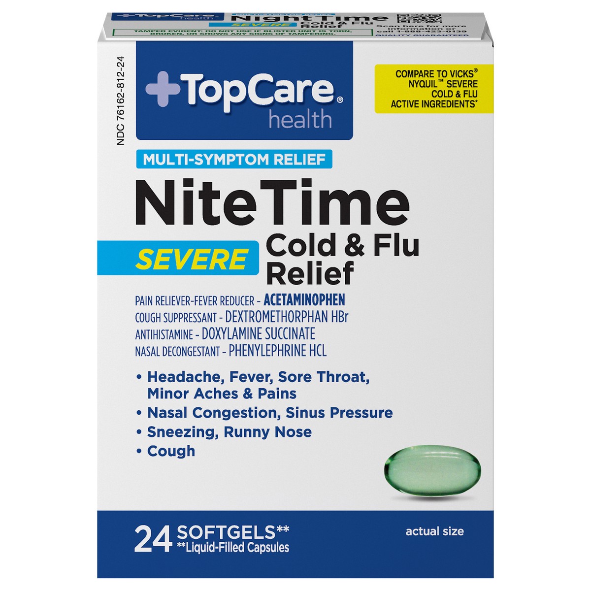 Pain reliever/Fever reducer - Acetaminophen. Cough suppressant - Dextromethorphan HBr. Antihistamine - Doxylamine succinate. Nasal decongestant - Phenylephrine HCI. 24 softgels (Liquid-filled capsules…