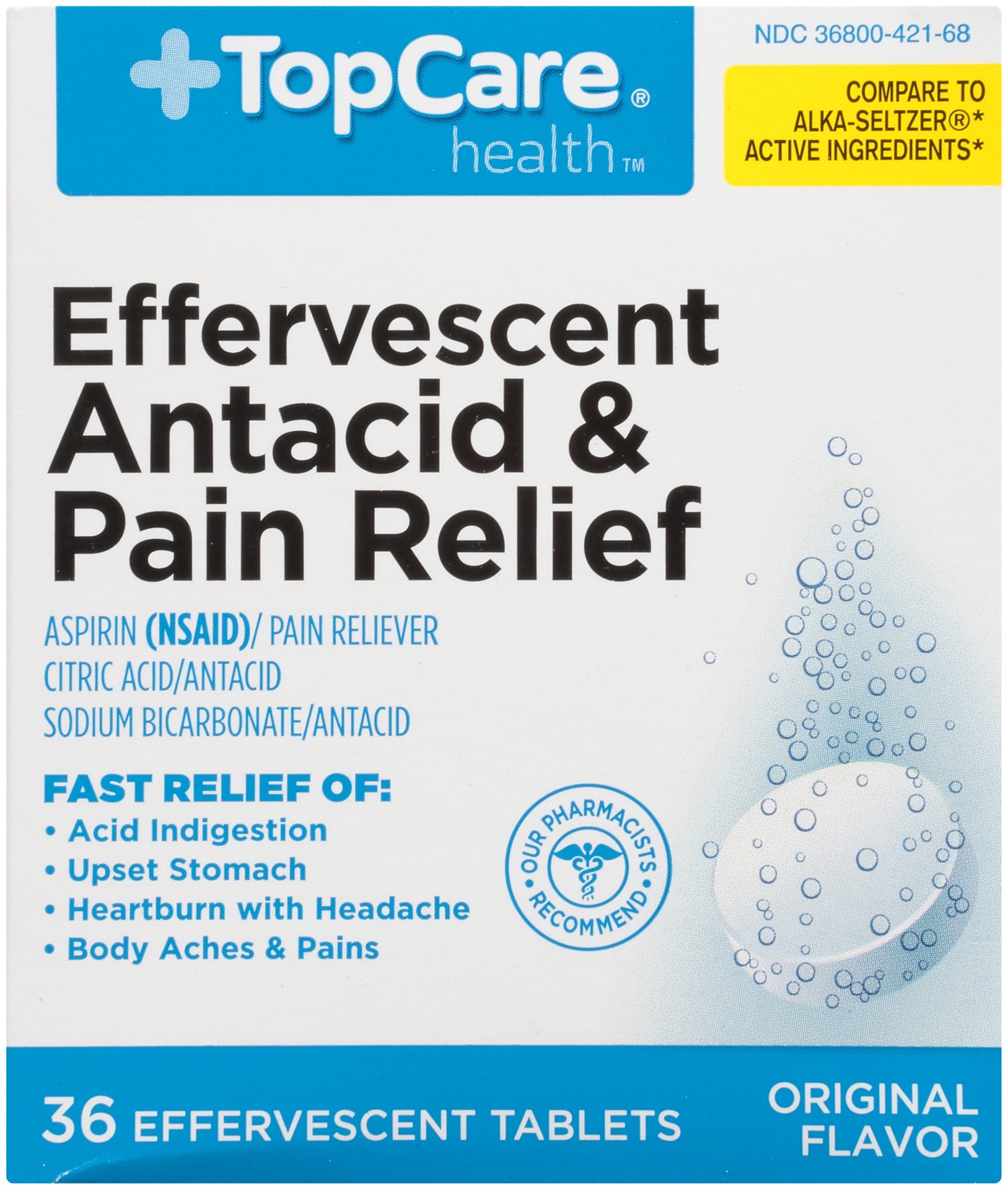 In Each Effervescent Tablet: Active Ingredients: Anhydrous Citric Acid (1000 mg), Antacid; *Aspirin (NSAID) (325 mg), Pain Reliever; Sodium Bicarbonate (Heat-Treated) (1916 mg), Antacid. *Nonsteroidal…