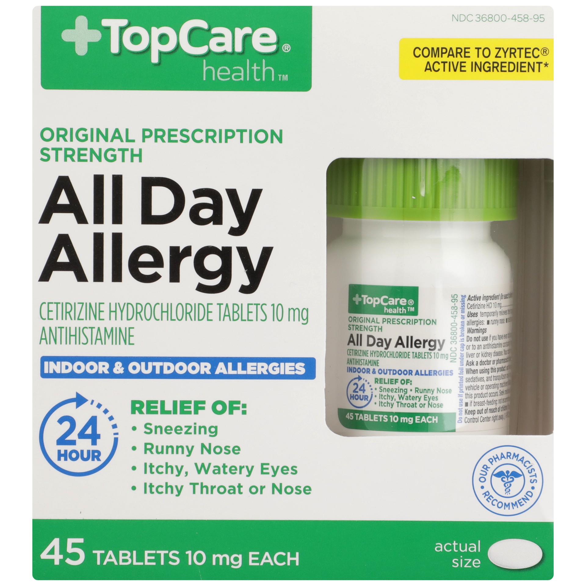 In Each Tablet: Active Ingredients: Cetirizine HCl (10 mg), Antihistamine. Inactive Ingredients: Corn Starch, FD&C Blue 1 Aluminum Lake, Hypromellose, Lactose Monohydrate, Magnesium Stearate, Polydext…