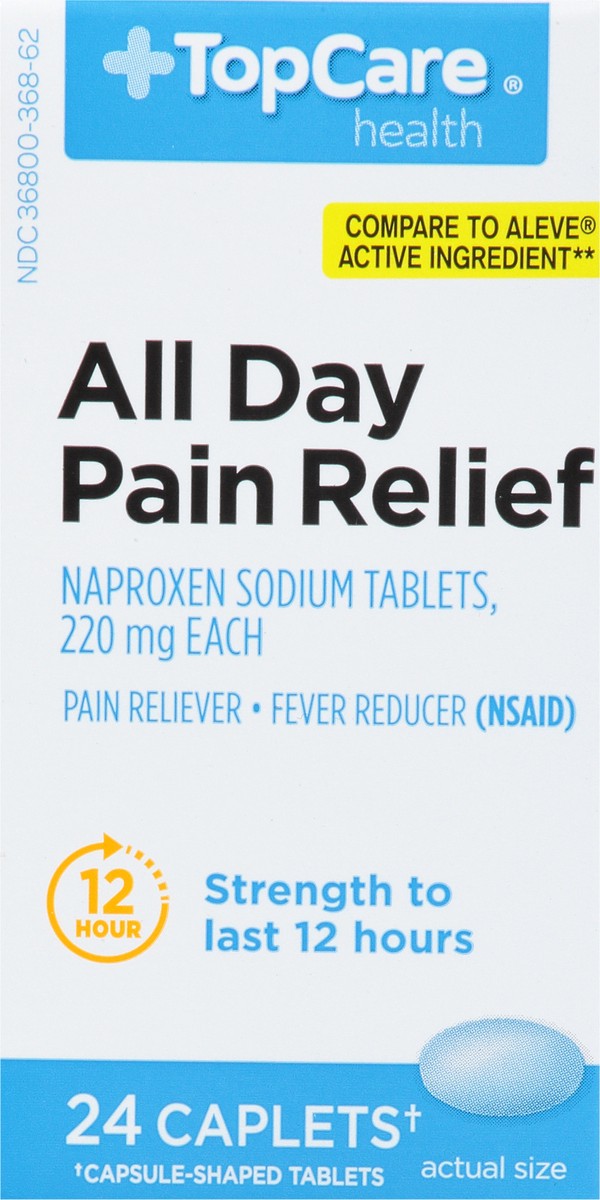 (In Each Caplet): Active Ingredients: Naproxen Sodium (Naproxen 200 mg) (NSAID) (220 mg), Pain Relever/Fever Reducer. Inactive Ingredients: FD&C Blue 2 Aluminum Lake, Hypromellose, Magnesium Stearate,…