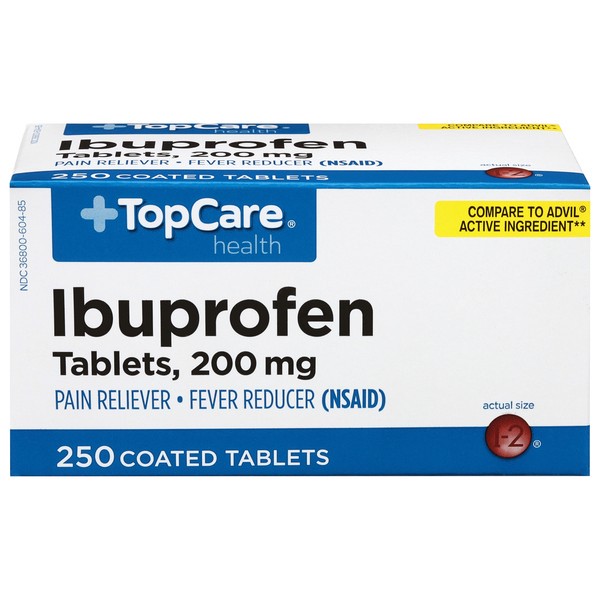 In Each Tablet: Active Ingredients: Ibuprofen (NSAID) (200 mg), Pain Reliever/Fever Reducer. Inactive Ingredients: Colloidal Silicon Dioxide, Corn Starch, Croscarmellose Sodium, Hypromellose, Iron Oxi…