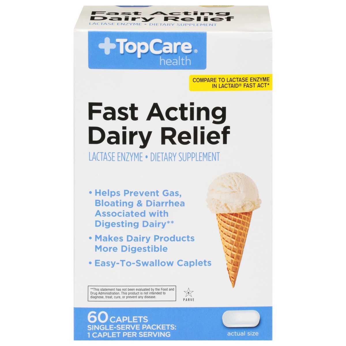 Dietary Supplement. Fast acting dairy relief. Single-serve packets. Convenient caplets. Prevents gas, bloating and diarrhea. Makes dairy products more digestible. Easy-to-swallow caplets. Quality guar…