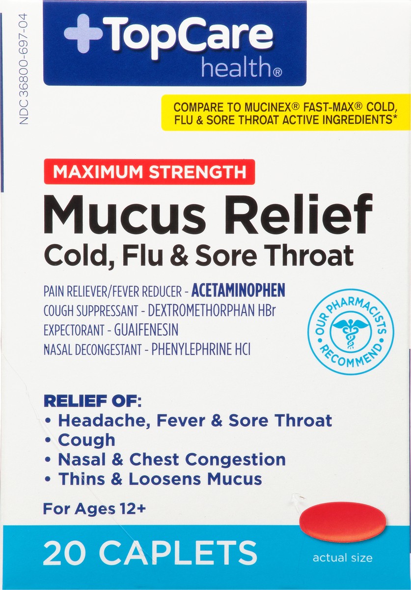 (In Each Caplet) Active Ingredients: Acetaminophen (325 mg), Pain Reliever/Fever Reducer; Dextromethorphan HBr (10 mg), Cough Suppressant; Guaifenesin (200 mg), Expectorant; Phenylephrine HCI (5 mg), …
