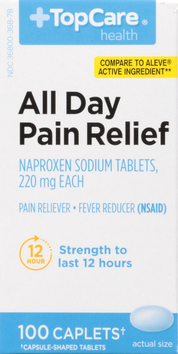 In Each Caplet Active Ingredients: *Naproxen Sodium (Naproxen 200 mg) (NSAID) (220 mg), Pain Reliever/Fever Reducer. Inactive Ingredients: FD&C Blue 2 Aluminum Lake, Hypromellose, Magnesium Stearate, …