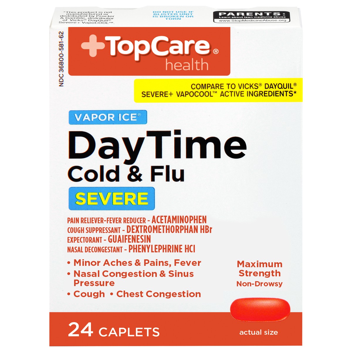 Pain reliever-fever reducer - Acetaminophen. Cough suppressant - Dextromethorphan HBr. Expectorant - Guaifenesin. Nasal decongestant - Phenylephrine HCl. Gluten Free. Compare to Vicks Dayquil Severe+ …