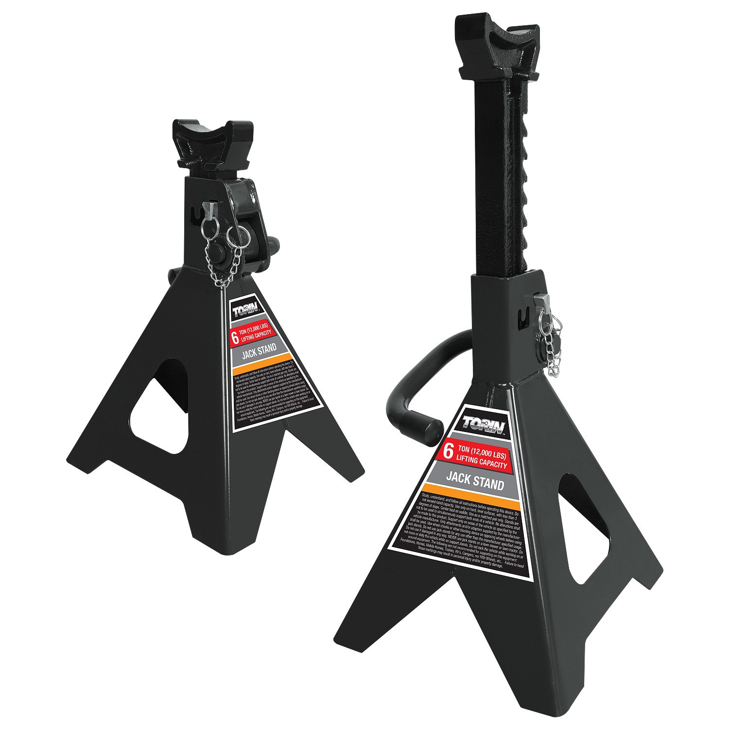 Features a lifting range of 15-3/8-in to 23-13/16-in with a 6 ton (12,000 lb) load capacity; Saddle has a large surface area that provides better contact with the load being supported. Wide pyramid st…