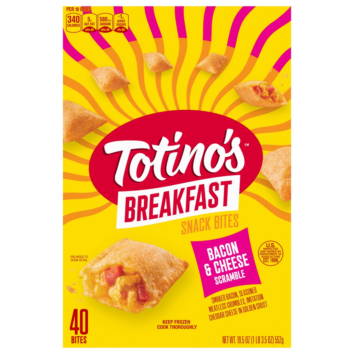 Pork shoulder bacon, seasoned meatless crumbles, imitation cheddar cheese in golden crust. Per 10 Bites: 330 calories; 4 g sat fat (21% DV); 690 mg sodium 30% DV); 3 g total sugars. Contains a bioengi…