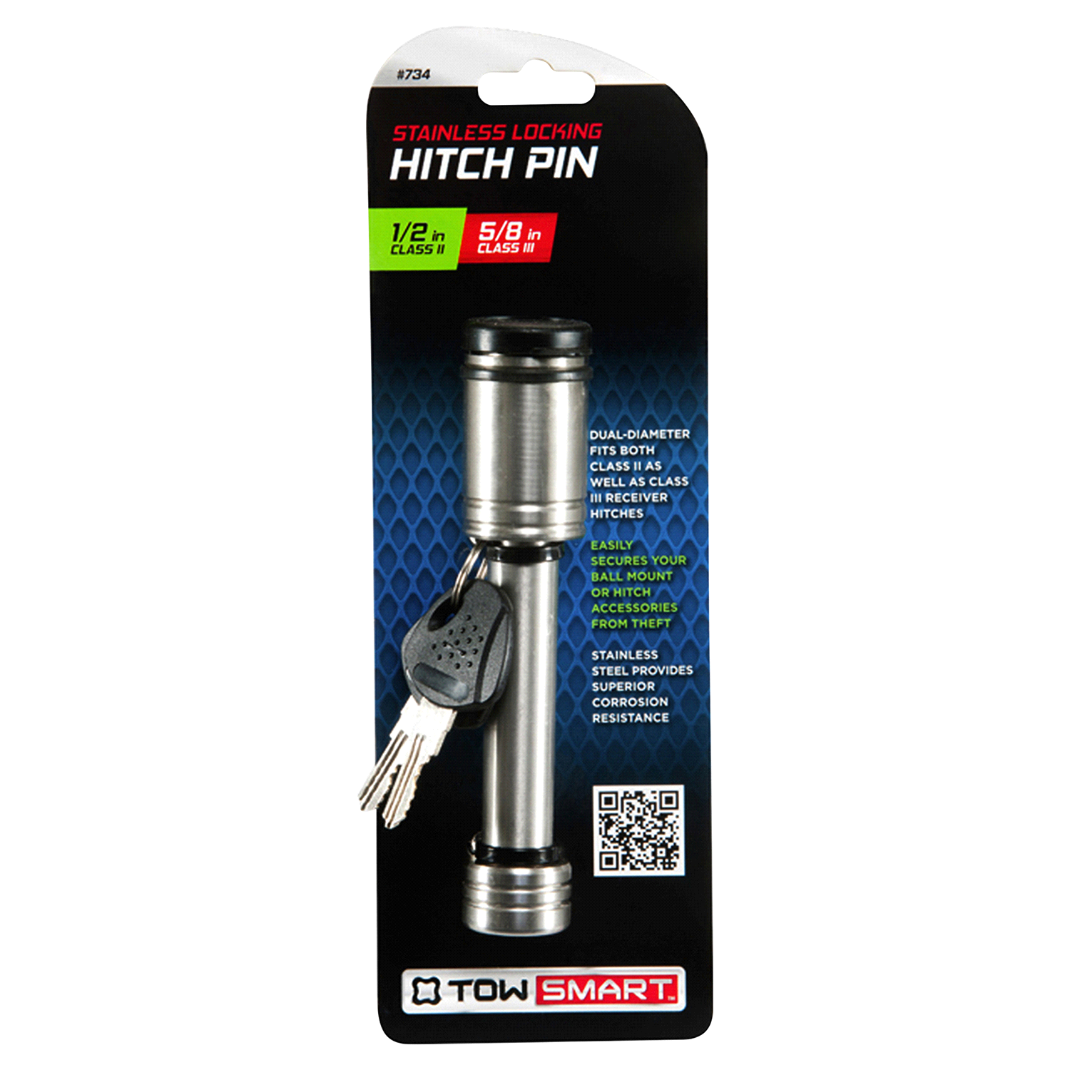 The TowSmart 1/2 Diameter Barrel Style Receiver Lock with Sleeve fits both Class II and Class III receivers. It is made of stainless steel providing superior corrosion resistance. The locking pin pr…
