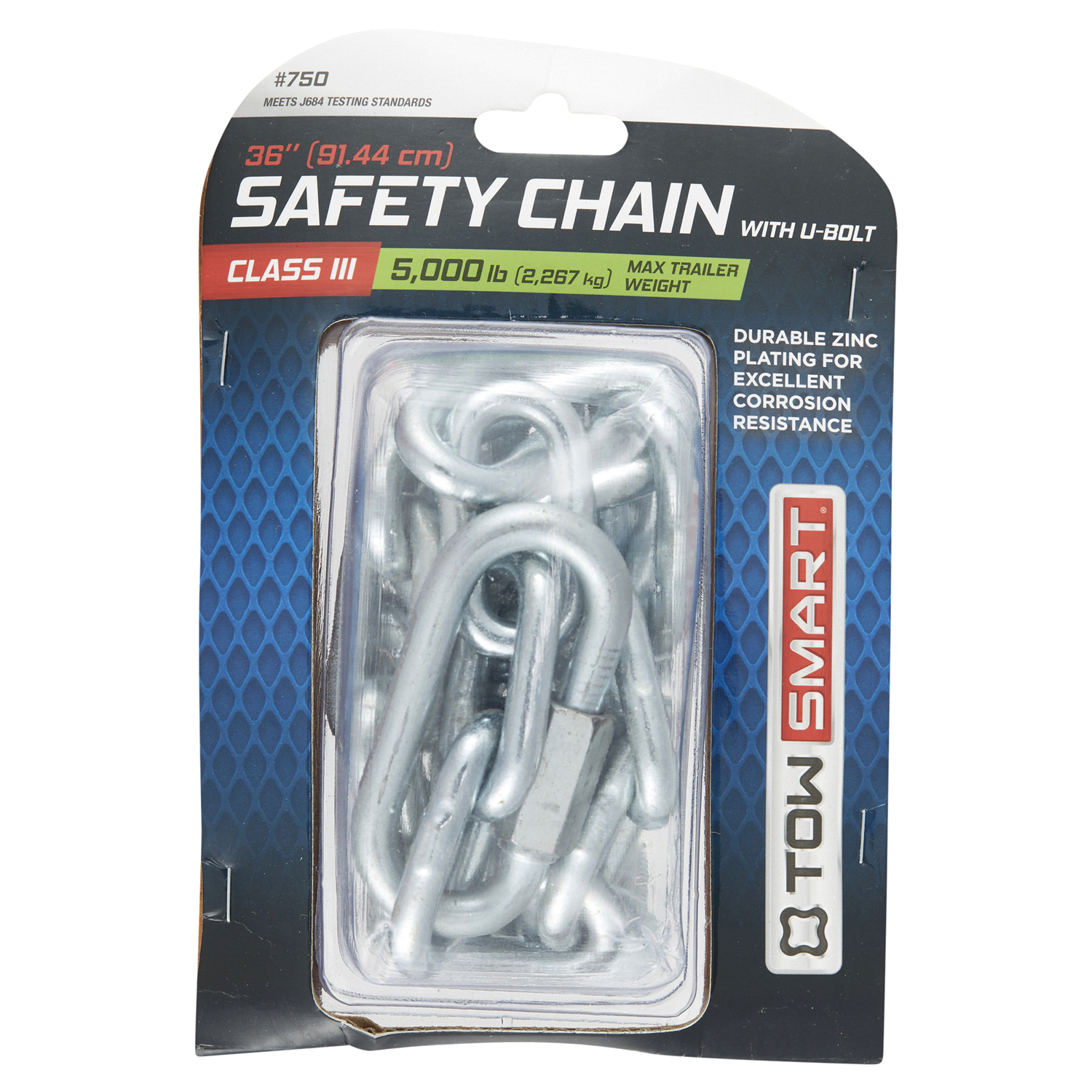The TowSmart 36 Towing Safety Chain is made of durable zinc plating for excellent corrosion resistance. It will includes U-Bolt, Quick Link and S Hooks.