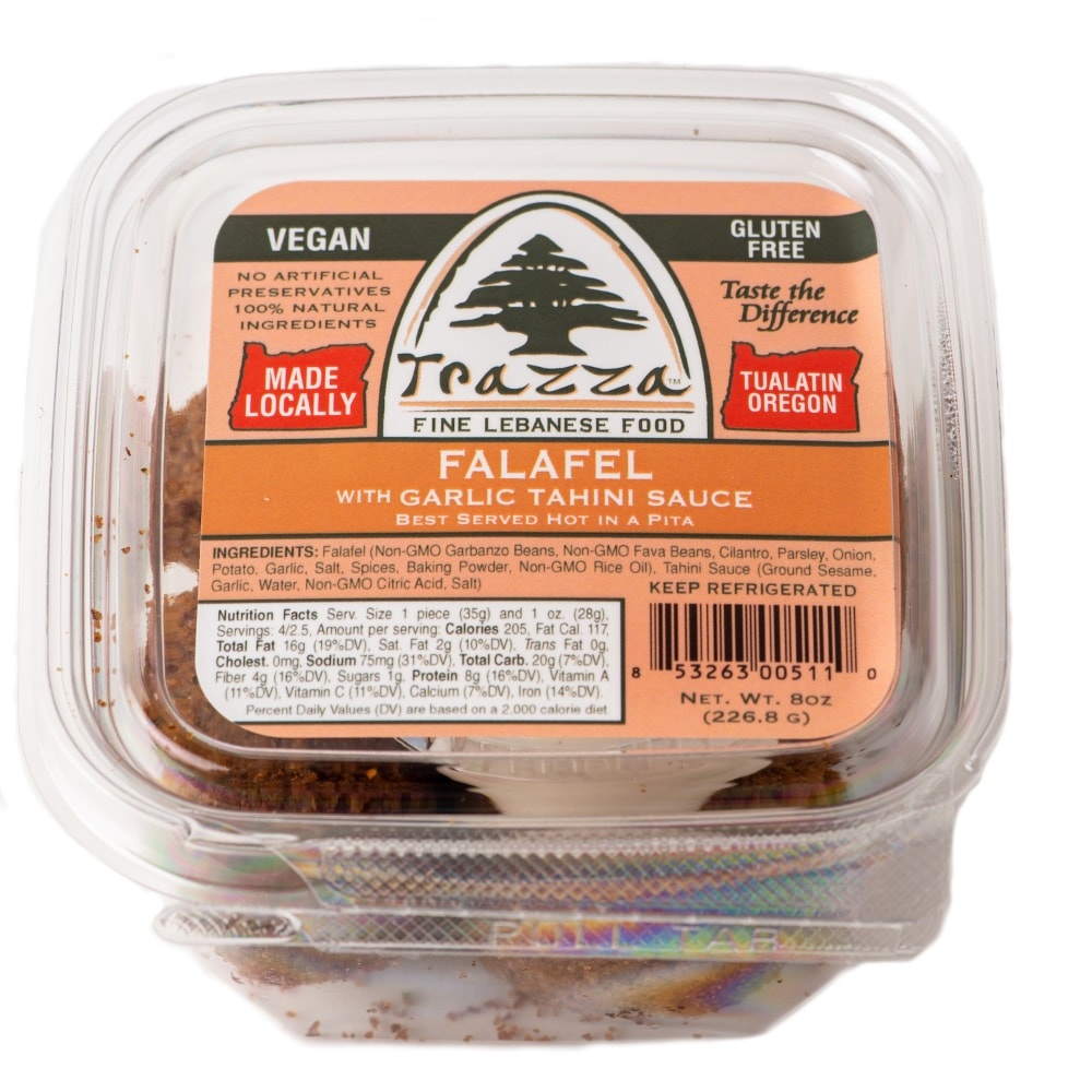 Falafel (non-gmo Garbanzo Beans, Non-gmo Fava Beans, Cilantro, Parsley, Onion, Potato, Garlic, Salt, Spices, Baking Powder, Non-gmo Rice Oil), Tahini Sauce (ground Sesame, Garlic, Water, 100% Lemon Ju…