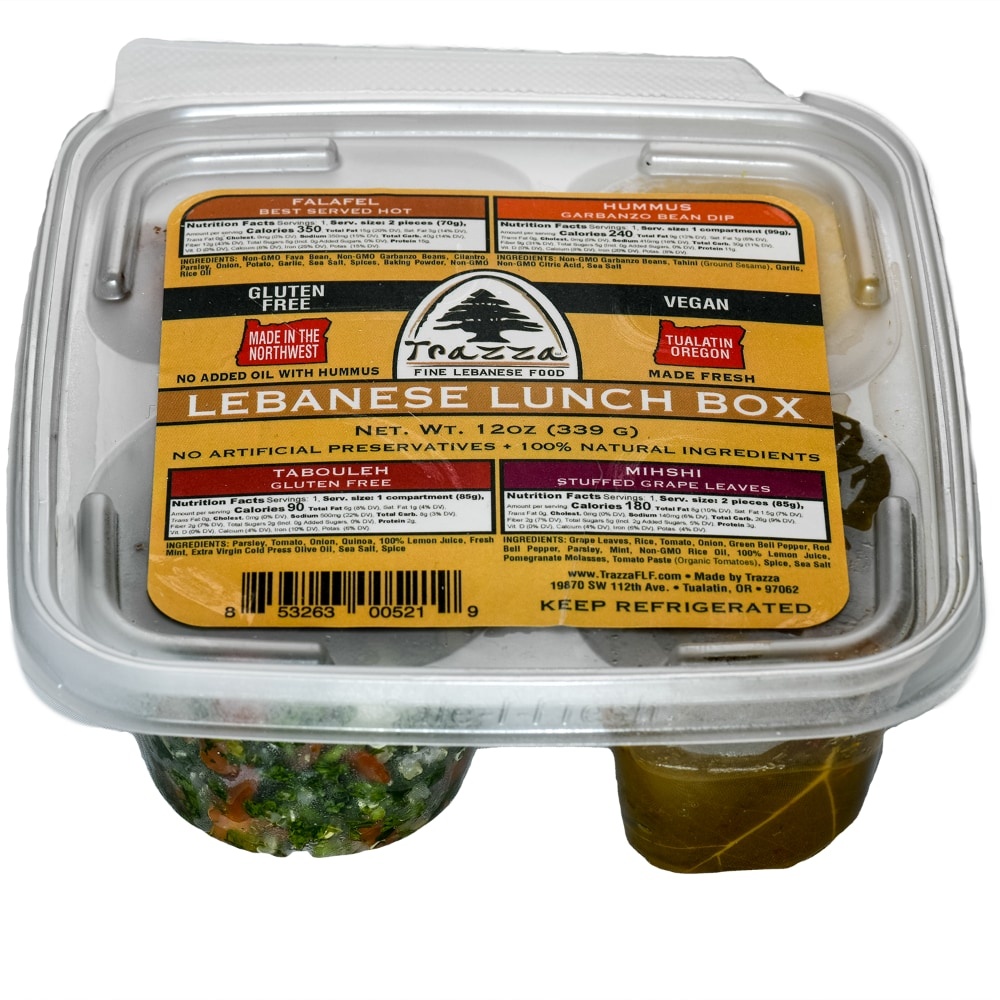Lunch box contains falafel, tabouleh, hummus, & stuffed grape leaves 100% natural ingredients No added oils No artificial preservatives Gluten free