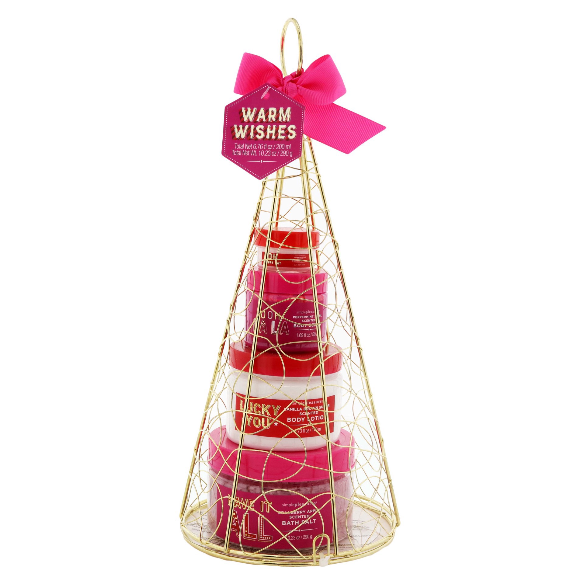 Warm Wishes TreeIncludes:- Sugar Frosting Scented Cuticle Cream .34 oz- Peppermint Swirl Scented Body Scrub 1.69 oz- Vanilla Brown Sugar Scented Body Lotion 4.73 oz- Cranberry Apple Scented Bath Salt …