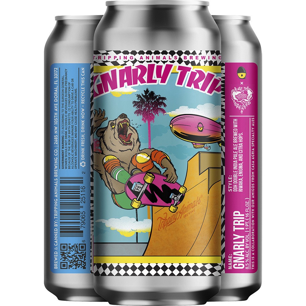United States - Florida - Tripping Animals Gnarly Trip is a Hazy Double India Pale Ale. This beer is Hopped with Riwaka , Enigma , Citra. Take this beer home today and enjoy!
