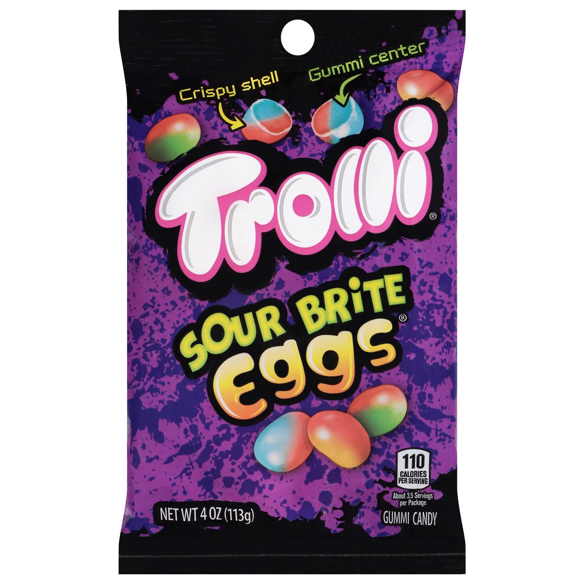 Trolli Sour Brite Eggs are chewy sour gummies in a crunchy candy shell that 'hatches' in your mouth Original flavor combinations: Cherry-Lemon, Strawberry-Grape and Orange-Lime