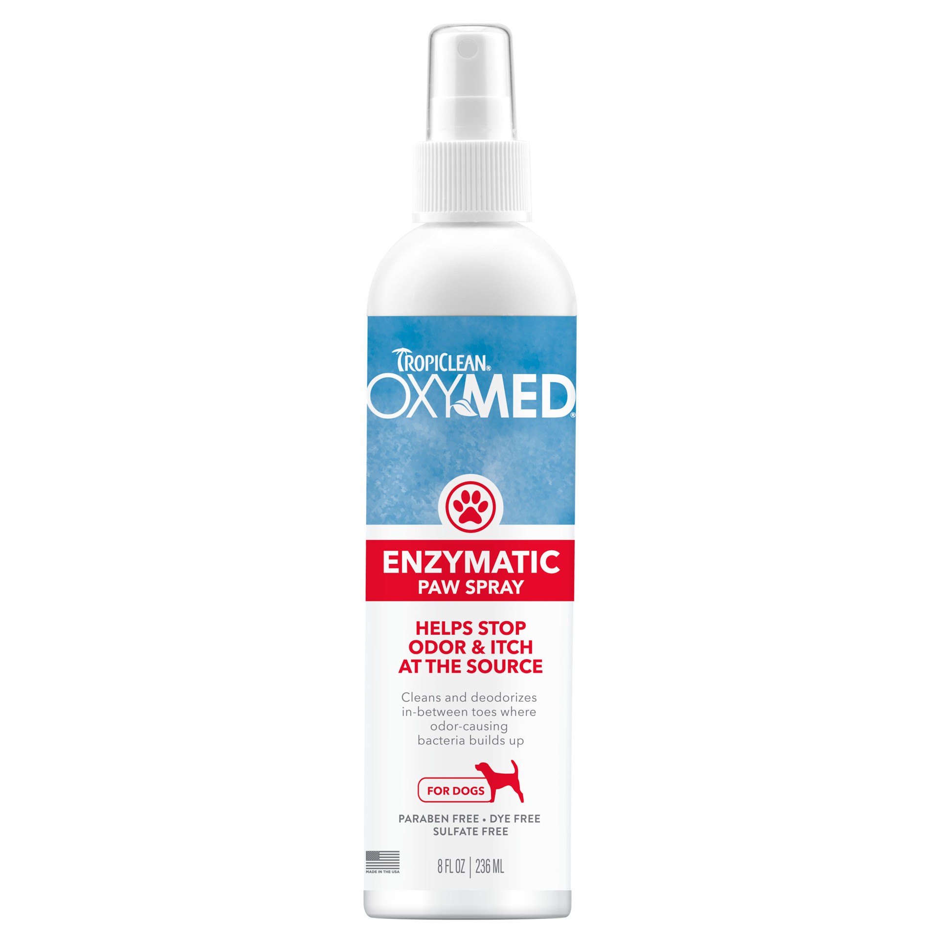 TropiClean OxyMed Enzymatic Paw Spray Helps Stop Odor & Itch at the Source. OxyMed Enzymatic Paw Spray contains an enzyme blend that promotes good, healthy itch-free paw hygiene. It cleans and reduces…