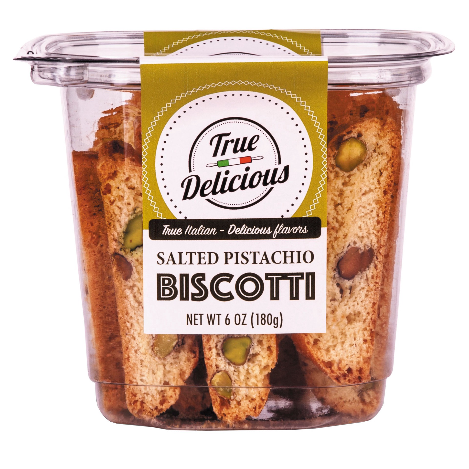 Fresh Italian salted pistachio biscotti ready for a cup of coffee or tea. - Made with California grown pistachios- Each 6oz pack contains approximately 14 biscotti- Locally sourced non-GMO ingredients…