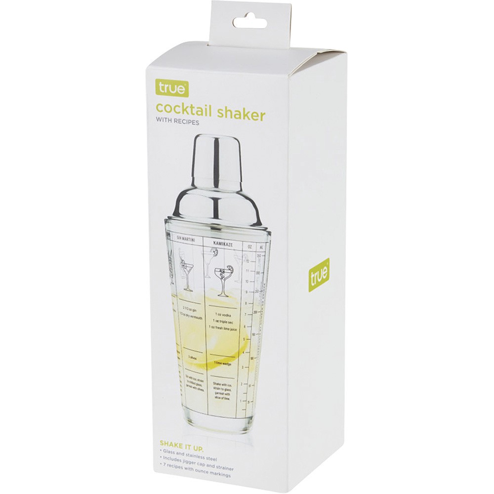 True Glass Cocktail Shaker with Cocktail Recipes, Clear Glass Shaker with Strainer, 13.5 oz
